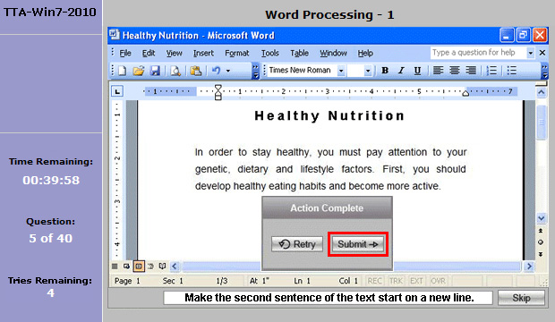 You can then click on the Submit button to skip the question and move to the next question.Note: “Skipped” questions are scored as wrong. If you skip a question, you cannot go back to it.