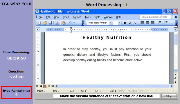 Tries Remaining indicates the number of tries you have left to complete a performance-based task. The maximum number of tries allowed is set by the test administrator.