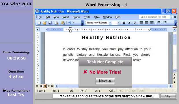 If you do not perform the task correctly on your last try, the Task Not Complete box will appear indicating No More Tries left. Click on the Next button to go to the next question.